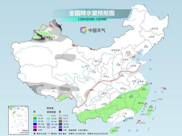 后天,新疆北部、西藏中部、甘肃河西等地部分地区有小到中雪或雨夹雪,其中,新疆北疆东部和伊犁河谷等地部分地区有大到暴雪,局地大暴雪。江南大部、西南地区南部、华南北部和西部、台湾岛等地部分地区有小雨。