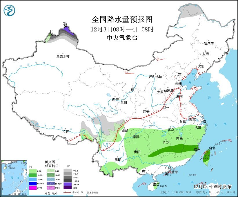 12月3日08时至4日08时,新疆北部、内蒙古东北部、黑龙江西北部、西藏西南部和东部、川西高原等地部分地区有小到中雪或雨夹雪,其中,新疆北疆北部等地部分地区有大到暴雪,局地大暴雪或特大暴雪(30~35毫米)。江南、西南地区东部和南部、华南北部和西部、台湾岛等地部分地区有小雨,其中,湖南南部、江西中南部、福建中部、广西东北部、台湾岛中北部等地部分地区有中雨。内蒙古中西部等地部分地区有4~6级风。
