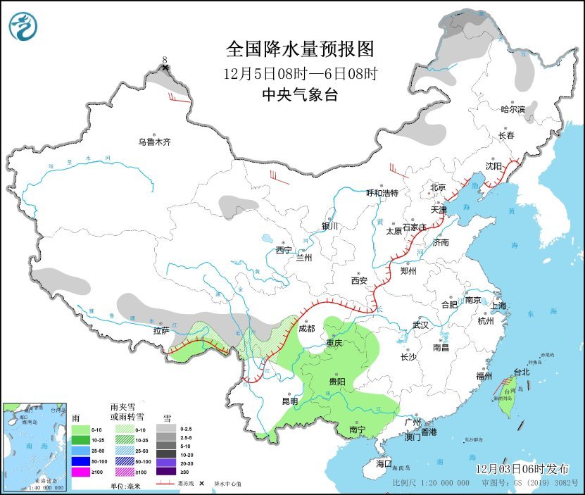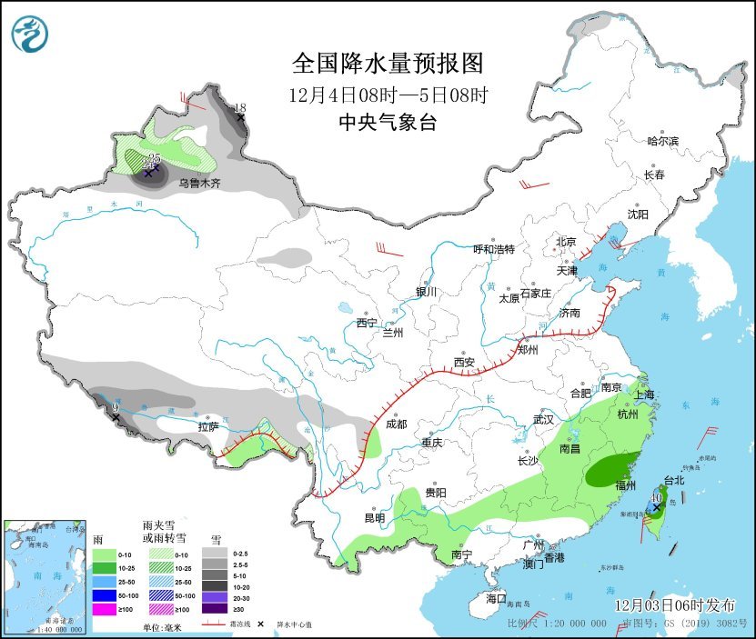 12月4日08时至5日08时,新疆北部、西藏西南部和东部等地部分地区有小到中雪或雨夹雪,其中,新疆北疆东部和沿天山地区、西藏西南部等地部分地区有大到暴雪,局地大暴雪(20~25毫米)。江南大部、云南东部和南部、华南北部和西部、台湾岛等地部分地区有小到中雨,其中,台湾岛中北部等地部分地区有大雨(25~40毫米)。内蒙古中西部、辽东半岛、新疆北部等地部分地区有4~6级风。