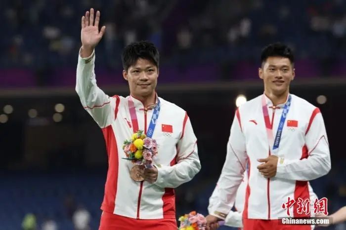 虽然错过了家门口举办的亚运会,但苏炳添却在杭州等来了自己的奥运奖牌。10月4日晚,杭州亚运会田径比赛结束后,中国奥委会为递补获得东京奥运会男子4×100米接力铜牌的汤星强、谢震业、苏炳添、吴智强颁发了奖牌。