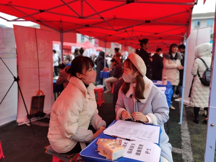 双选会现场,毕业生们手持简历,积极咨询各用人单位,寻找心仪的岗位。学习护理专业的毕业生张琳早早来到现场,将关注点放在了各家医疗机构。