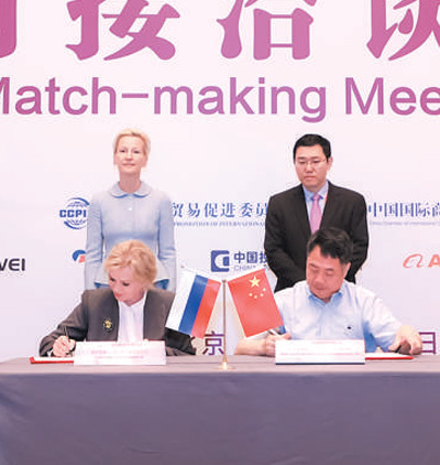2023年6月5日,俄罗斯企业家柳德米拉·谢尔巴科娃(前排左)在2023金砖国家女性领导力论坛对接洽谈会上同中方企业商签合作文件。受访者供图