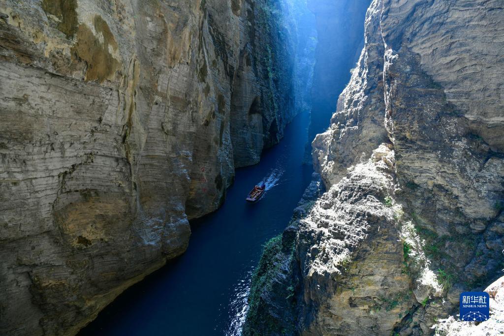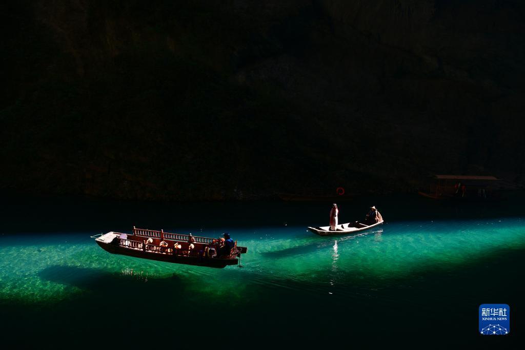 12月4日,游客在鹤峰县容美镇屏山峡谷乘船观光。新华社记者 杨文斌 摄