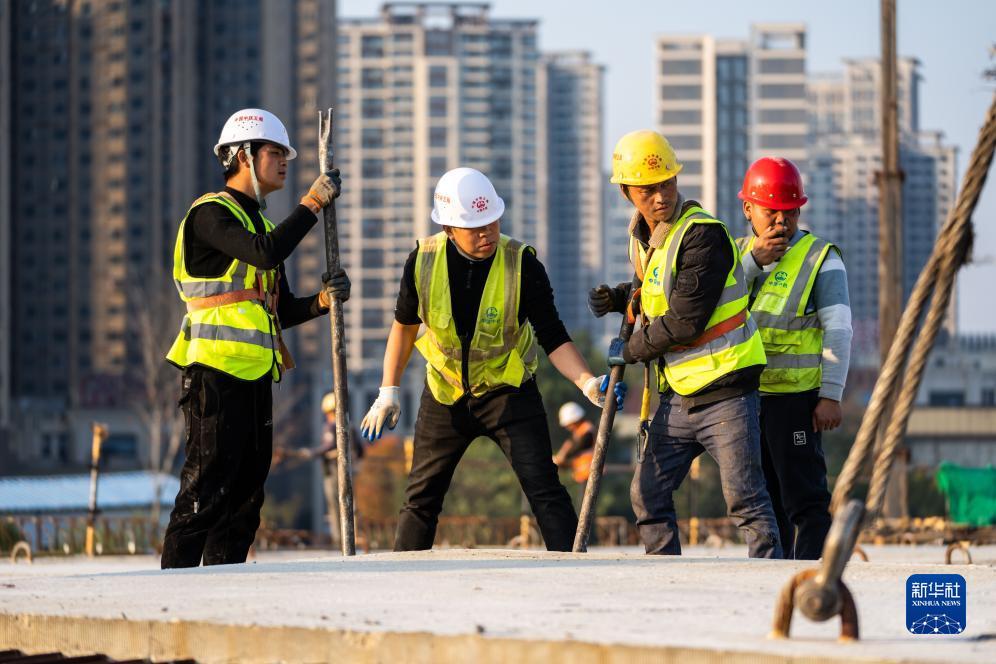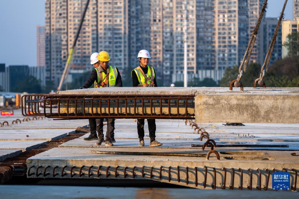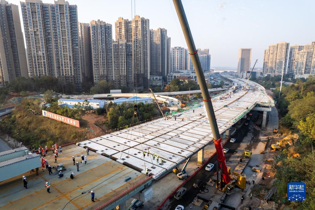 12月4日,工人在长沙万家丽路快速化改造北延线工程施工现场进行桥面板安装作业。新华社记者 陈思汗 摄