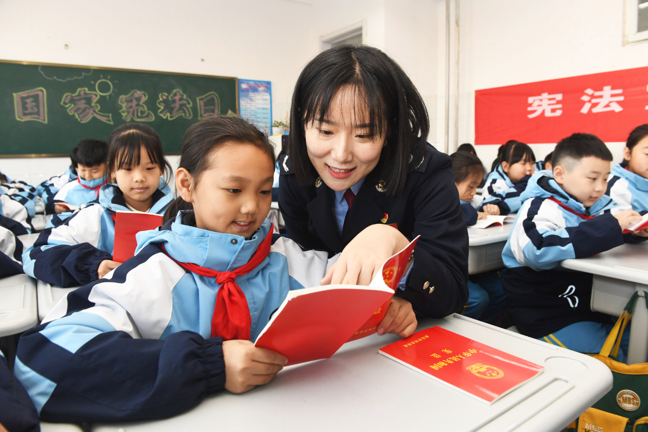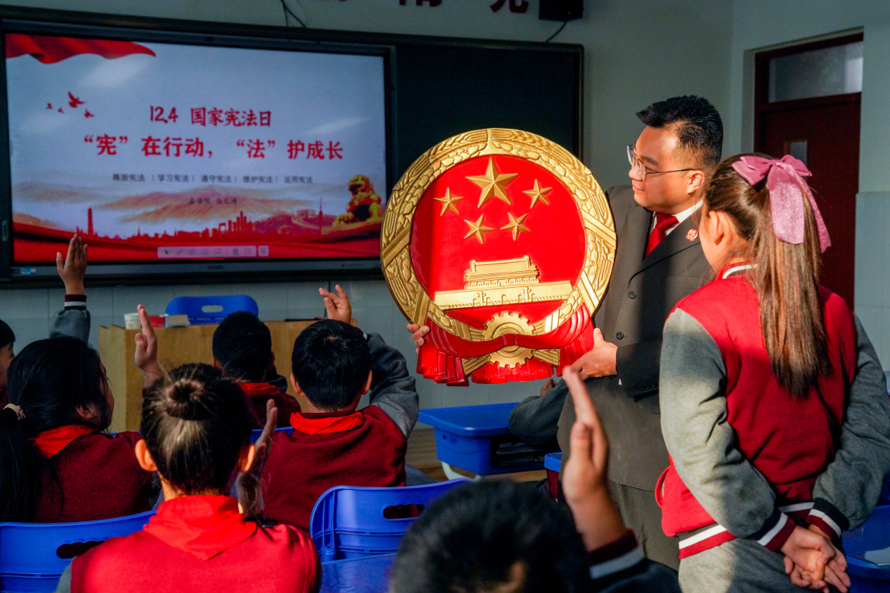 12月4日,山东省枣庄市,市中区人民法院的法官来到文化路小学为学生们宣传宪法知识。(本报通讯员 吉喆 摄)