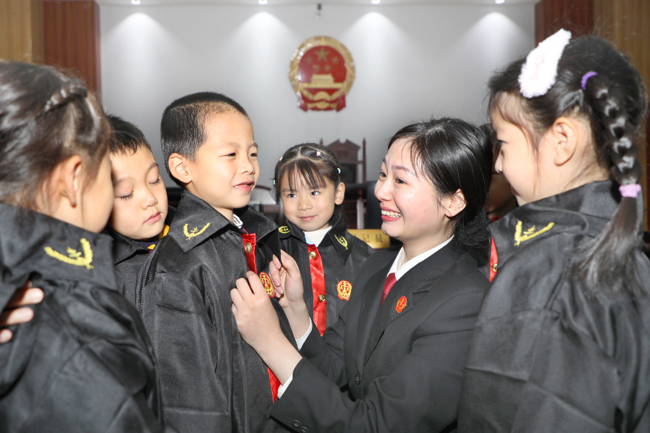 12月4日,安徽省六安市裕安区平安东苑幼儿园的小朋友在裕安区人民法院工作人员的帮助下穿上法袍、试敲法槌,体验一回“小法官”。(本报通讯员 田凯平 摄)