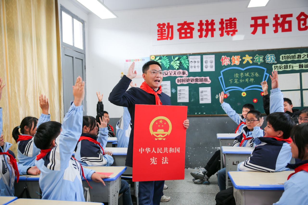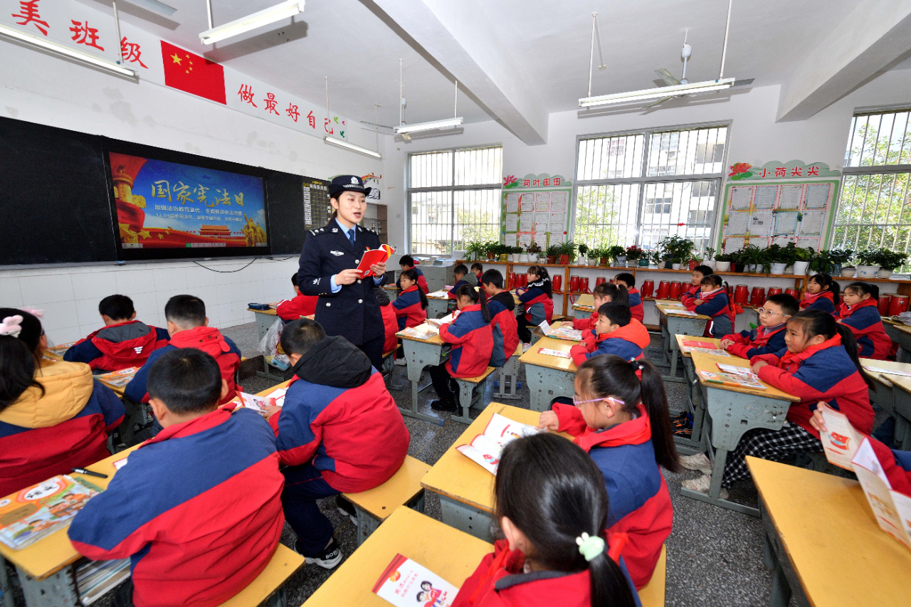 12月4日,在湖北省襄阳市保康县城关镇小学,民警对学生进行宪法教育。(本报通讯员 杨韬 摄)