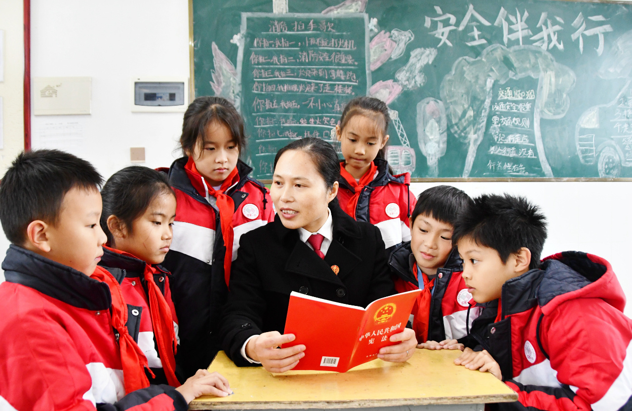 12月4日,湖南省永州市江永县第一小学,法官和学生一起阅读宪法读本。(本报通讯员 田如瑞 摄)