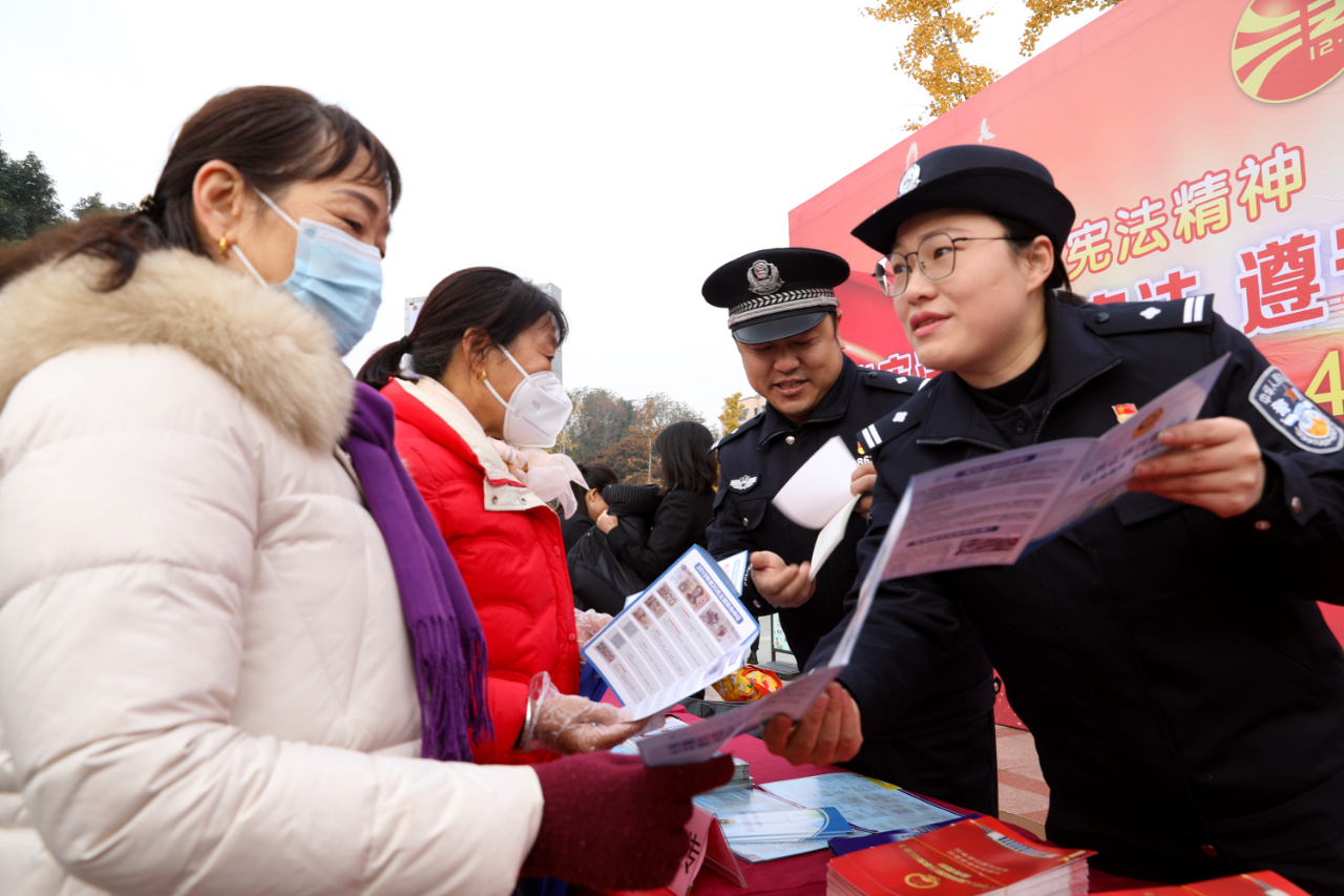 12月4日,江苏省宝应县公安局组织开展普法宣传活动,民警走进广场、学校、农村,普及法律知识,回答群众法律咨询问题,引导群众树立宪法意识,自觉遵守宪法,维护宪法权威,营造良好法治环境。(本报通讯员 沈冬兵 摄)