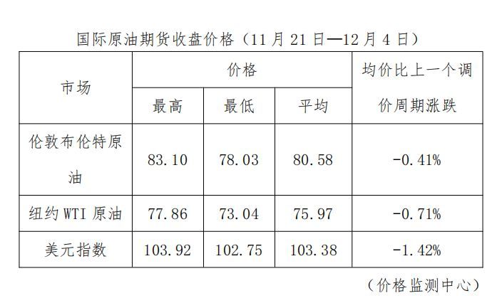 据国家发改委价格监测中心监测,本轮成品油调价周期内(11月21日—12月4日)国际油价小幅下降。平均来看,伦敦布伦特、纽约WTI油价比上轮调价周期下降0.56%。