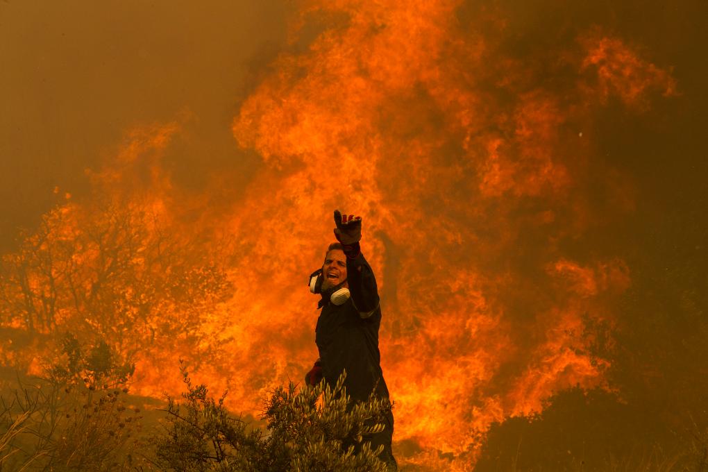 2023年8月22日,消防员在希腊首都雅典附近的查西亚村灭火。新华社发(马里奥斯·罗洛斯 摄)
