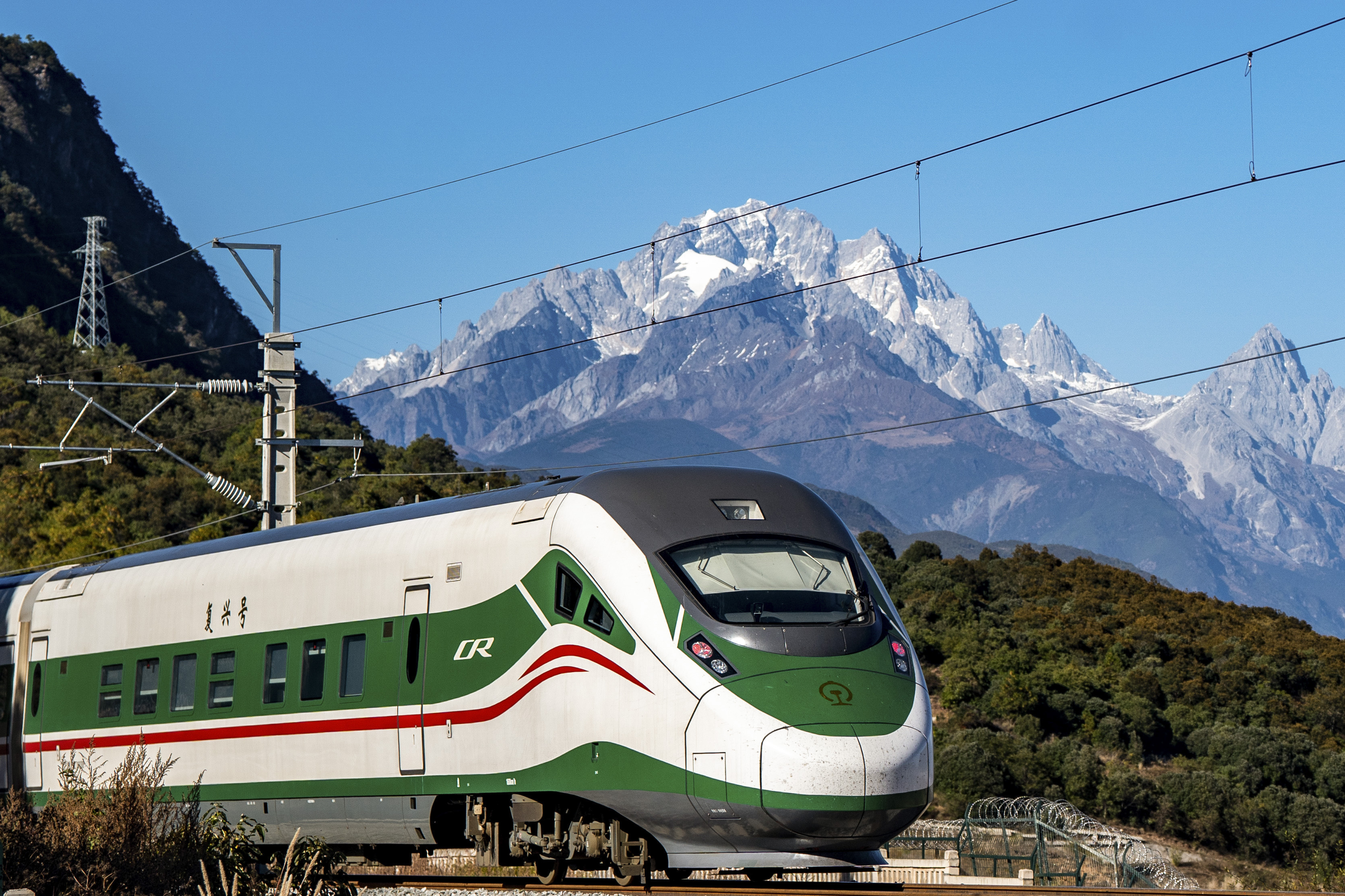 2023年11月26日,列车从玉龙雪山脚下驶过。 新华社记者 胡超 摄