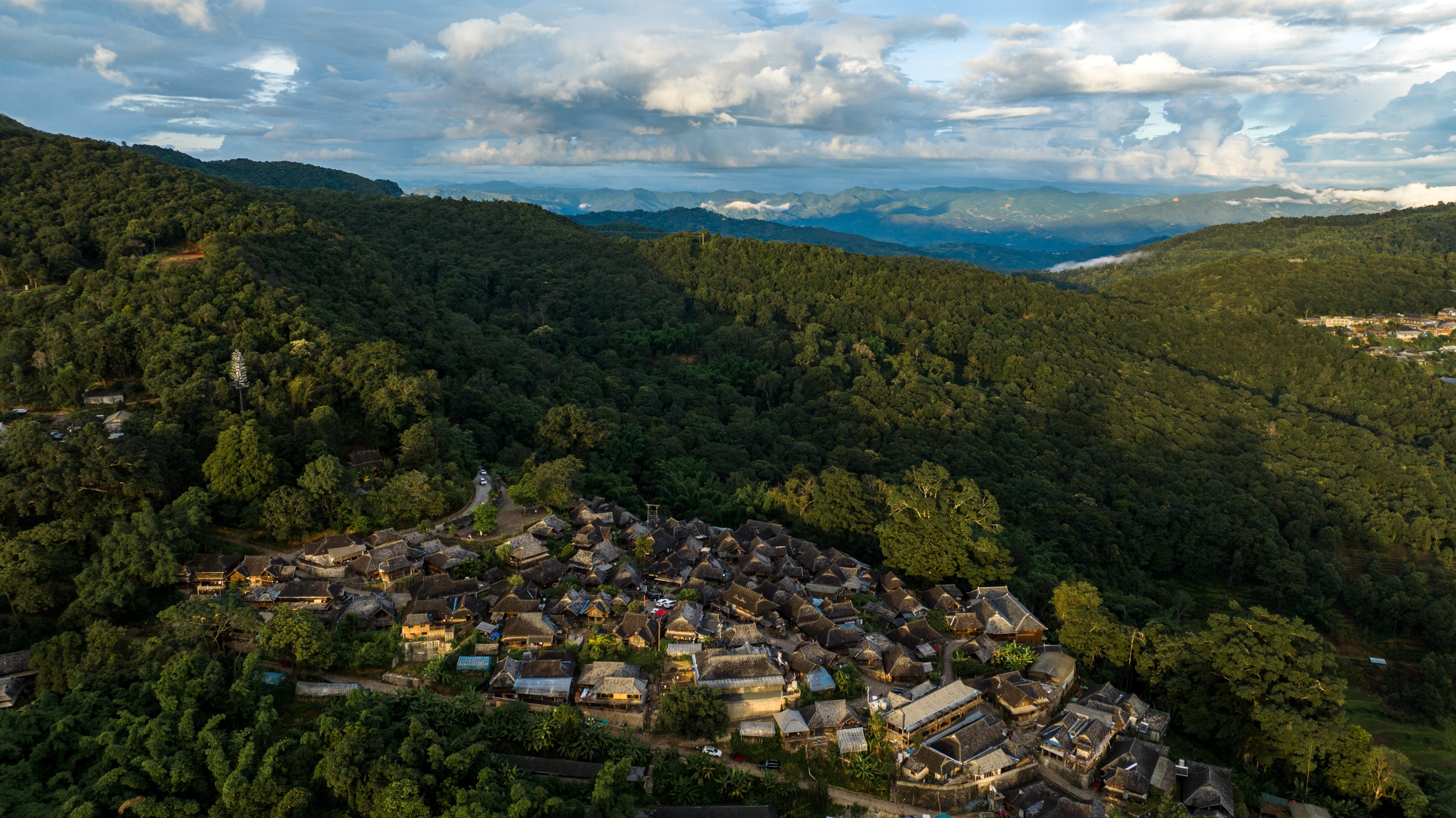 被山林与茶园环绕的云南普洱市景迈山翁基古寨一景(无人机全景照片,2023年9月18日摄)。新华社记者 胡超 摄