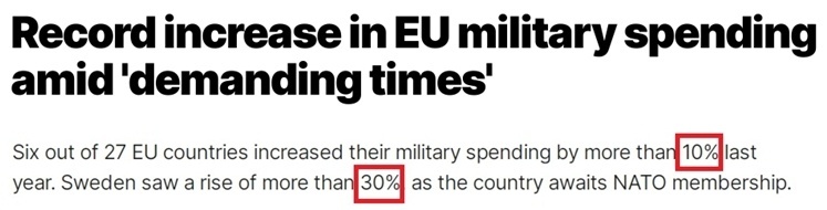 正在谋求加入北约的瑞典表现最积极,军费开支增加了30%以上。