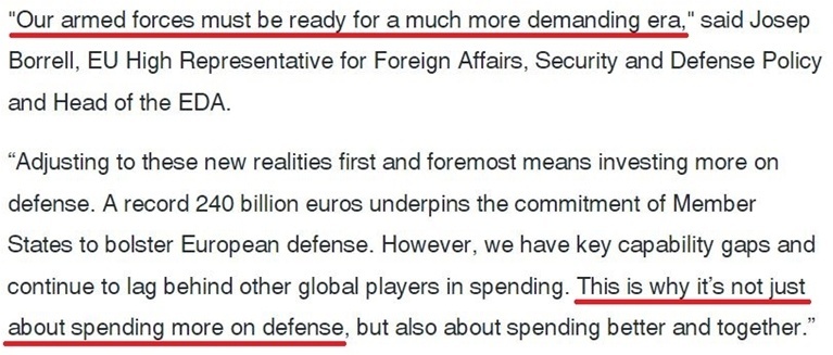 欧洲防务局负责人、欧盟外交与安全政策高级代表博雷利称,欧盟国家军队“必须为一个要求更高的时代做好准备”,而“适应新的现实首先意味着加大国防投入”。
