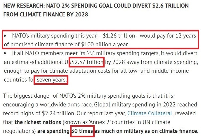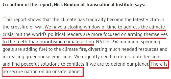 他指出,北约的最低军费目标为气候变化火上浇油,不仅转移了急需的资源,还大大增加了温室气体排放。