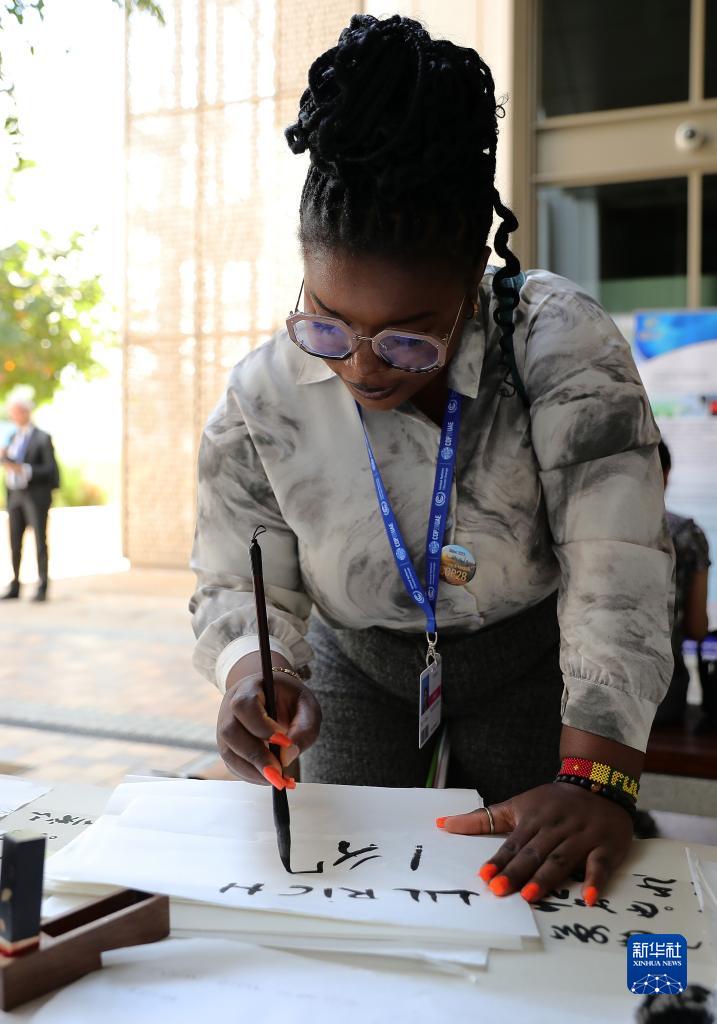12月6日,在联合国气候变化迪拜大会中国角,工作人员向参会者展示毛笔书法。新华社记者 王东震 摄