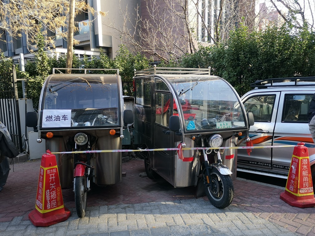 12月7日,记者在小区内看到,小区里仍有个别老年代步车停放,一辆车身上带有“残疾人机动轮椅车”车贴,但没有合法车牌的代步车,在车头玻璃醒目位置贴着“燃油”二字;自行车棚附近,车内被装满杂物的代步车,也贴着同样的标记;两辆停在楼前通道上,有残疾人轮椅车正式车牌的三轮车,贴上的“燃油”标记倒较为合理。魏女士说,这个小区在“11.9”前后连续发生火灾,之前有大量老年代步车停在通道上,本月初物业开始集中清理,很短时间内,之前的几十辆车都不见了。“那些电动车不见了之后,这些贴着‘燃油’字样的就特突出,我也不知道是不是今后还能开。”
