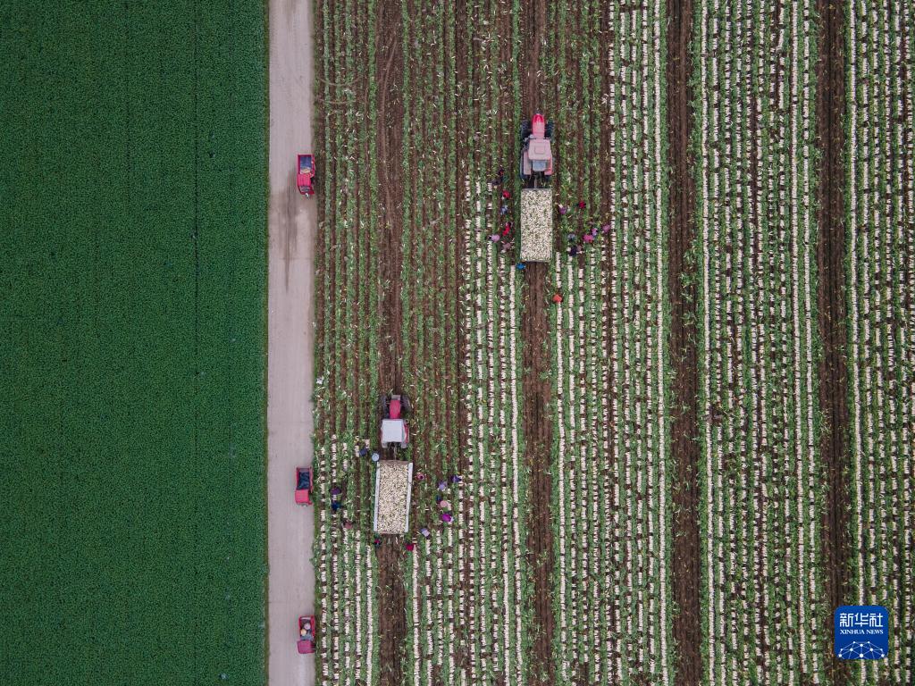12月5日,在重庆市合川区太和镇,村民们在重庆市康东蔬菜种植股份合作社将收获的白萝卜装车(无人机照片)。新华社记者 储加音 摄