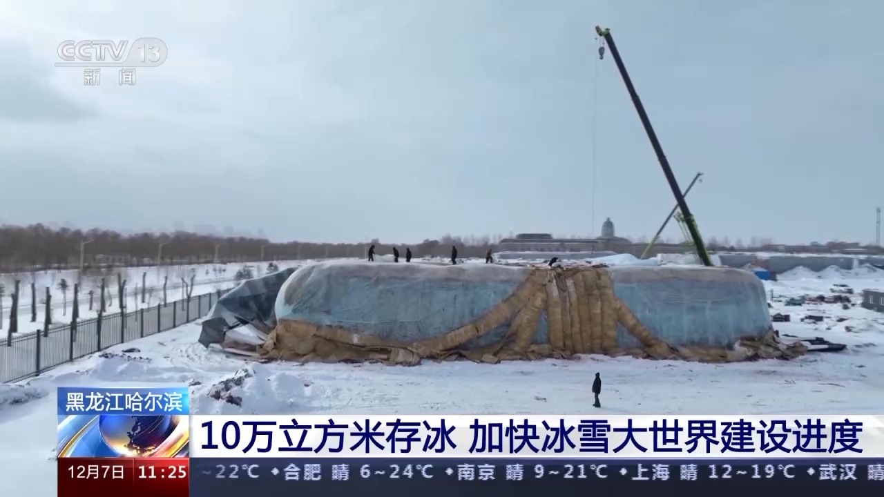 画面中这些被盖起来的是一个个大冰垛,就是今年哈尔滨冰雪大世界提前开工的秘密,这里面一共存了10万立方米的冰,这些冰都是上一个冬天提前从松花江中采好储备的。