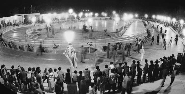 1982年10月9日,我国当时最大的旱冰场在北京工人体育场内落成,参加北京市“环球杯”旱冰速滑邀请赛的九省市代表队进行了旱冰表演。 叶用才摄