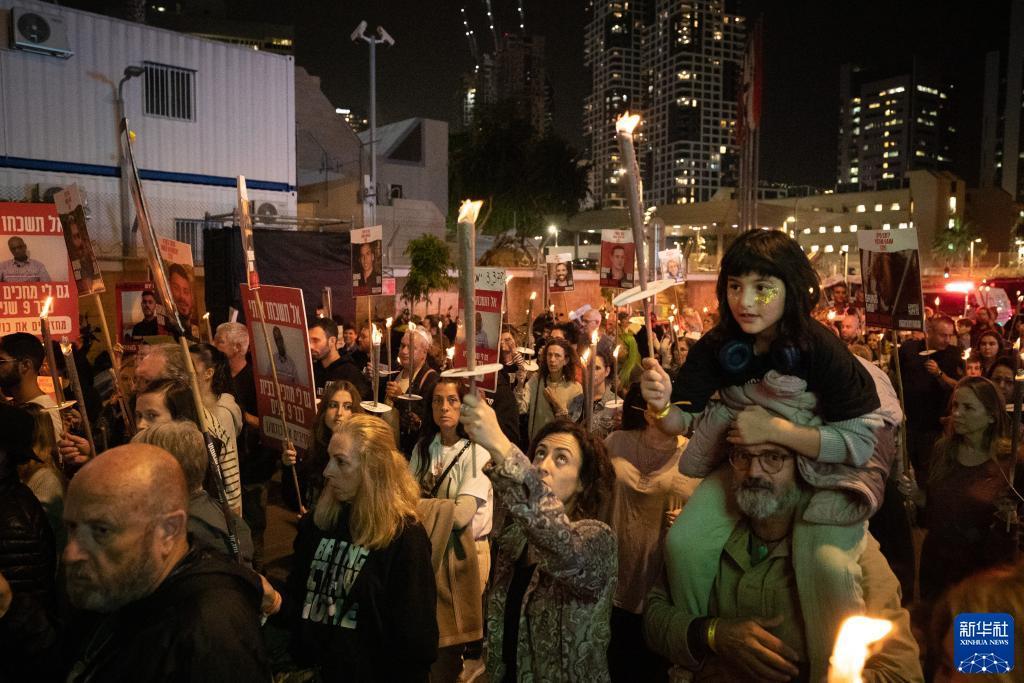 12月7日,在以色列特拉维夫,人们手举点亮的蜡烛参加集会。