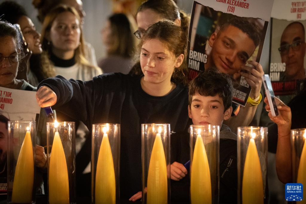 当日,犹太教传统节日光明节来临。本轮巴以冲突已持续两个月,人们在这个特殊的光明节里点亮蜡烛,祈盼被扣留在加沙地带的人员早日归来。