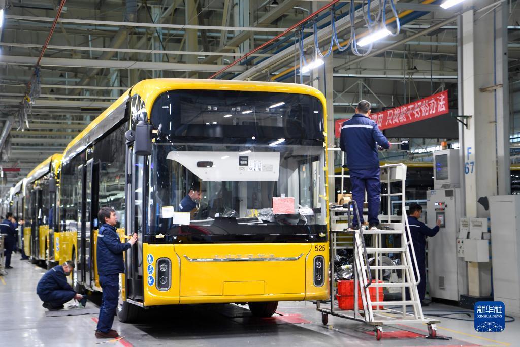 2023年11月30日,工作人员在宇通新能源厂区高端及海外承装车间作业。新华社记者 郝源 摄