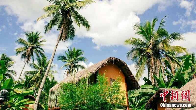 图为掩映在椰林中的王下乡特色茅草屋民宿。凌楠 摄