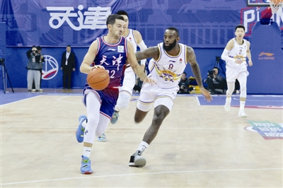 图为天津男篮队员(左)在比赛中。 今晚报记者 周伟摄