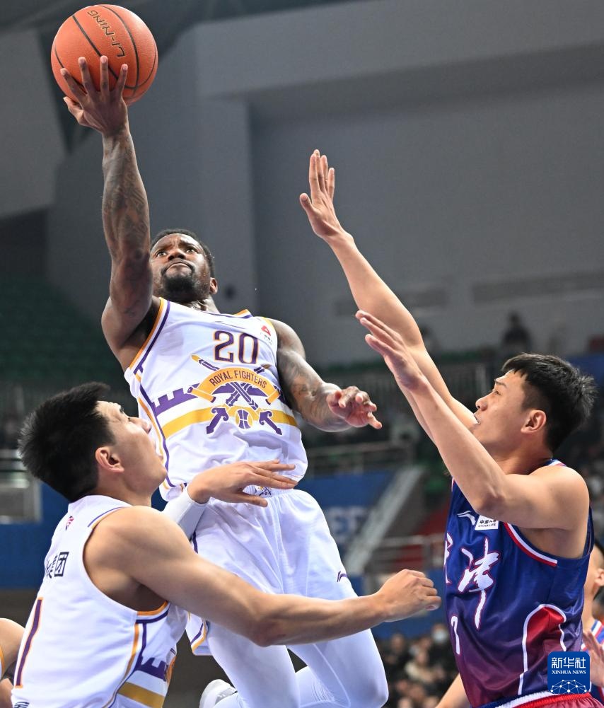 12月8日,北京控股队球员费尔德(中)在比赛中上篮。