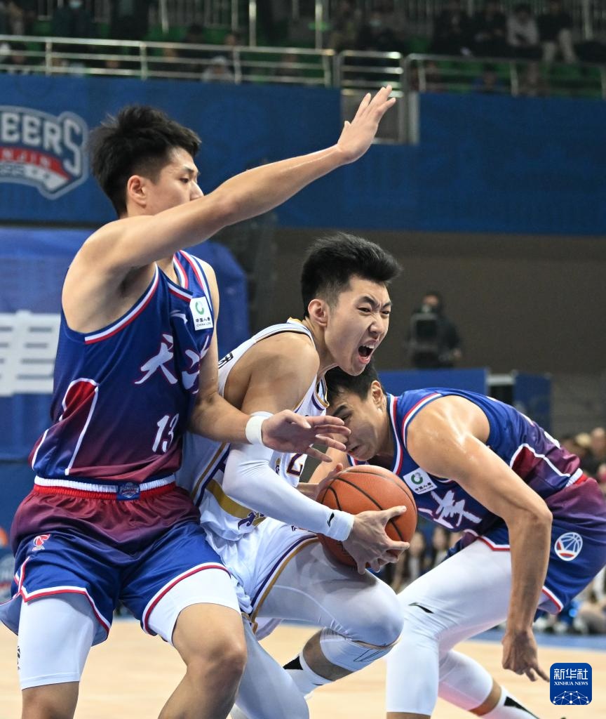 12月8日,北京控股队球员廖三宁(中)在比赛中进攻受阻。
