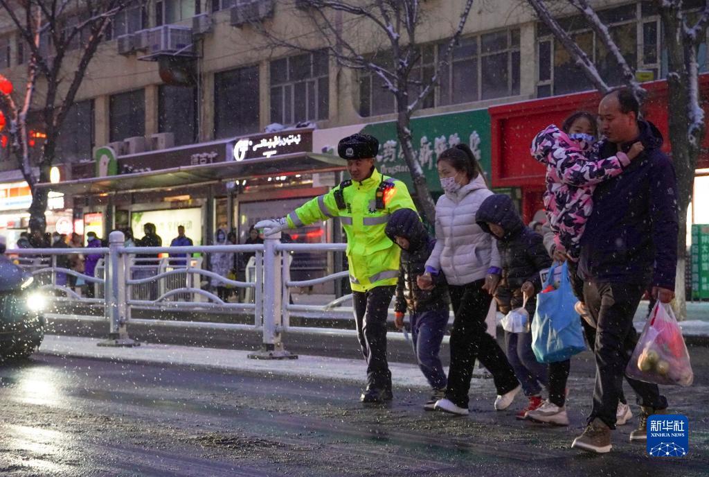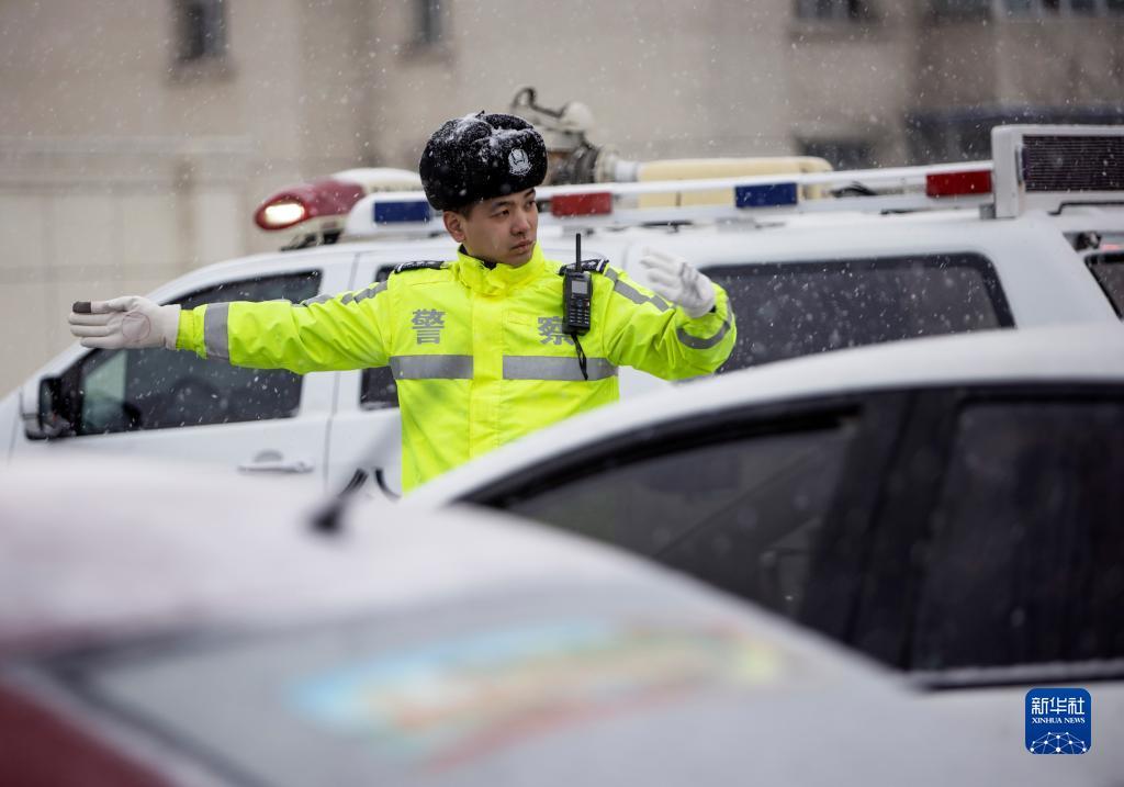 12月9日,乌鲁木齐市公安局交警支队新市区大队民警在指挥疏导车辆。新华社记者 王菲 摄