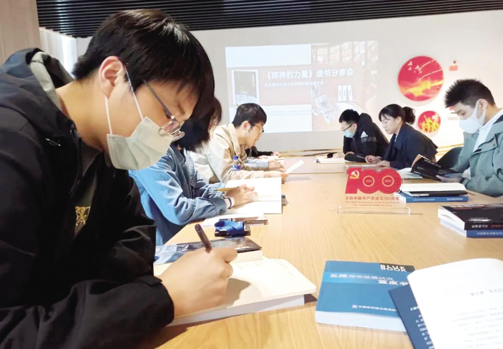 在航天科技集团五院513所职工书屋,职工们正在参与阅读活动。