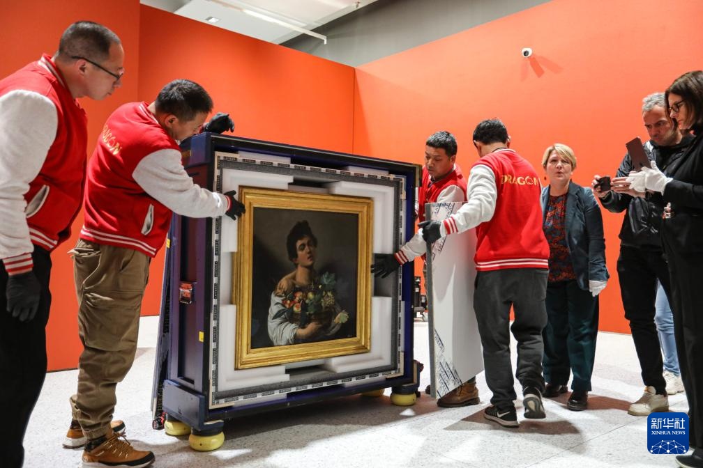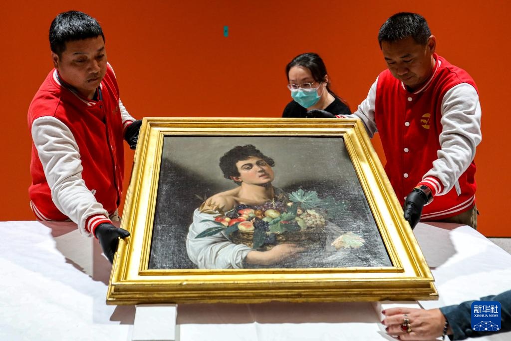 12月8日,工作人员在开箱仪式上展示卡拉瓦乔的作品《捧果篮的男孩》。