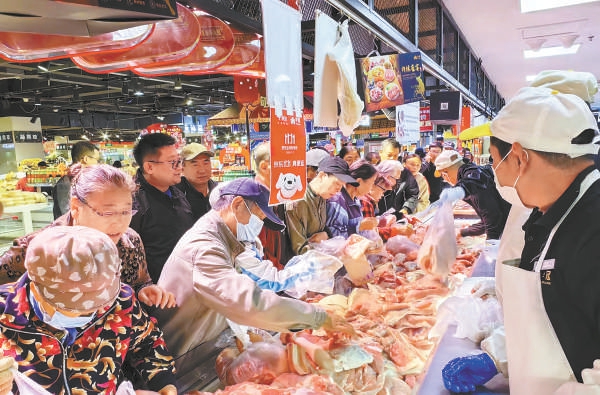 昨天,物美学清路店的猪肉销售区人头攒动,大块前后尖7.68元/斤、棒骨8.98元/斤……不少市民正排队选购。相关负责人介绍,物美这三日陆续向市场投放共两万头平价猪,确保供应充足。