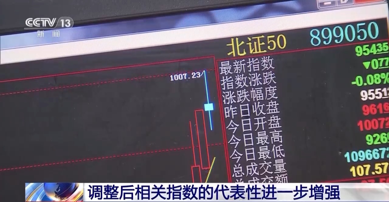 总台央视记者 董彬:在追踪资本市场走势的指标中,股票指数是一类综合反映市场变化的工具,也是组合投资业绩评价的重要基准。今天沪深北三家交易所都对重要指数进行了一些相应调整。具体来看: