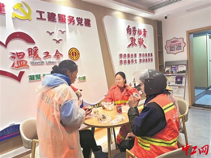 2023年12月9日早晨,环卫工人、志愿者等在上饶市工人文化宫爱心驿站享用爱心早餐。当天共发放60份早餐。
