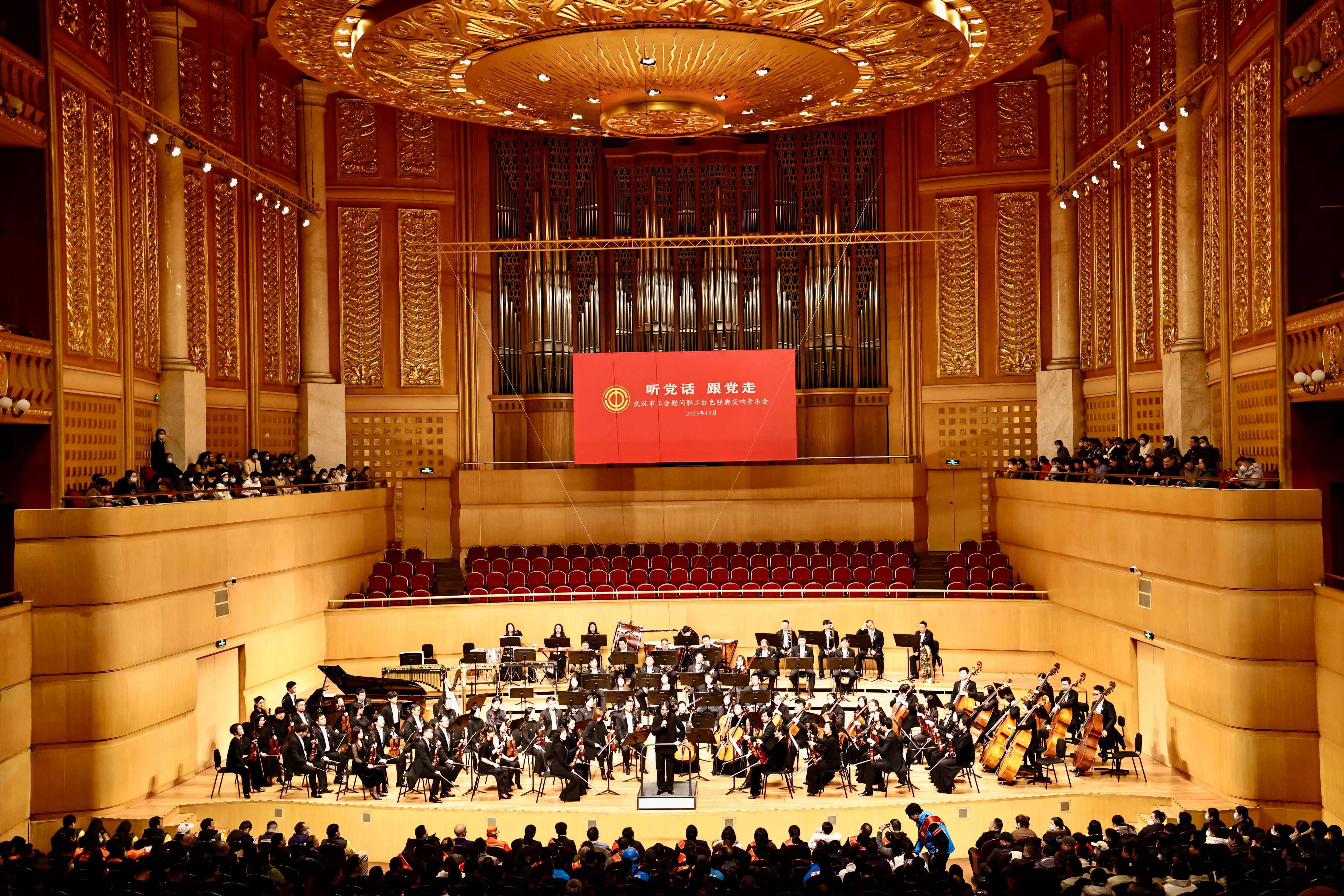 长江日报大武汉客户端讯(长江日报记者谭德磊 通讯员何宝清 胡雪莹)12月12日,武汉市总工会联合市文旅局、武汉爱乐乐团、琴台音乐厅举办“听党话 跟党走”——武汉市工会慰问职工红色经典交响音乐会,组织劳模先进人物、新就业形态劳动者、一线职工等1300余名代表走进琴台音乐厅,欣赏红色经典交响乐。