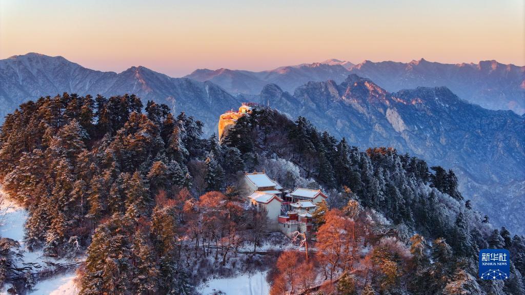 12月12日拍摄的雪后华山南峰和金天宫(无人机照片) 。新华社发(赵哓罡摄)