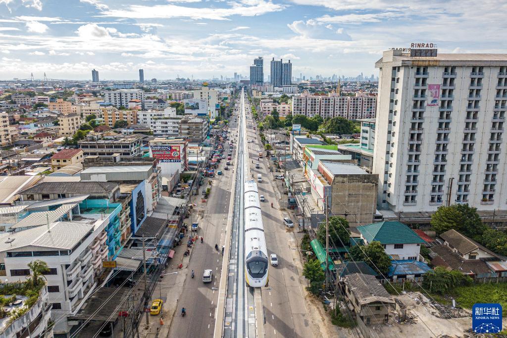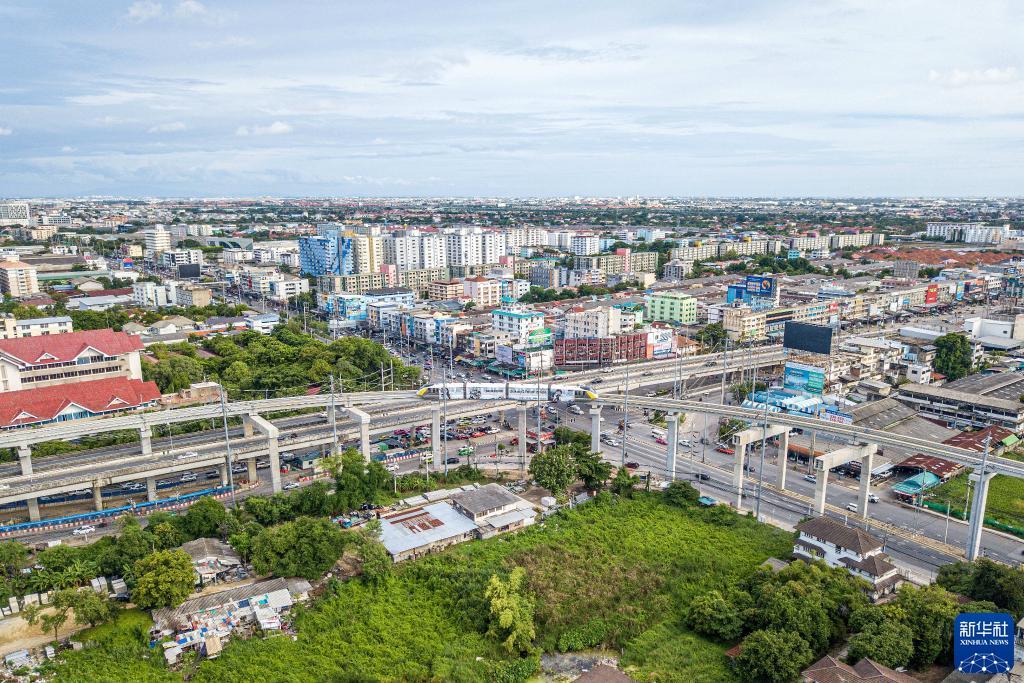 这是9月17日在泰国曼谷拍摄的“黄线”列车(无人机照片)。