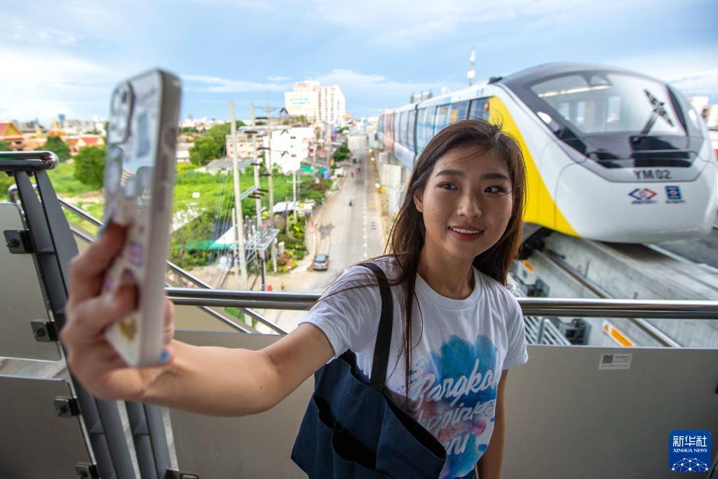 9月17日,一名中国旅客在泰国曼谷与“黄线”列车自拍。