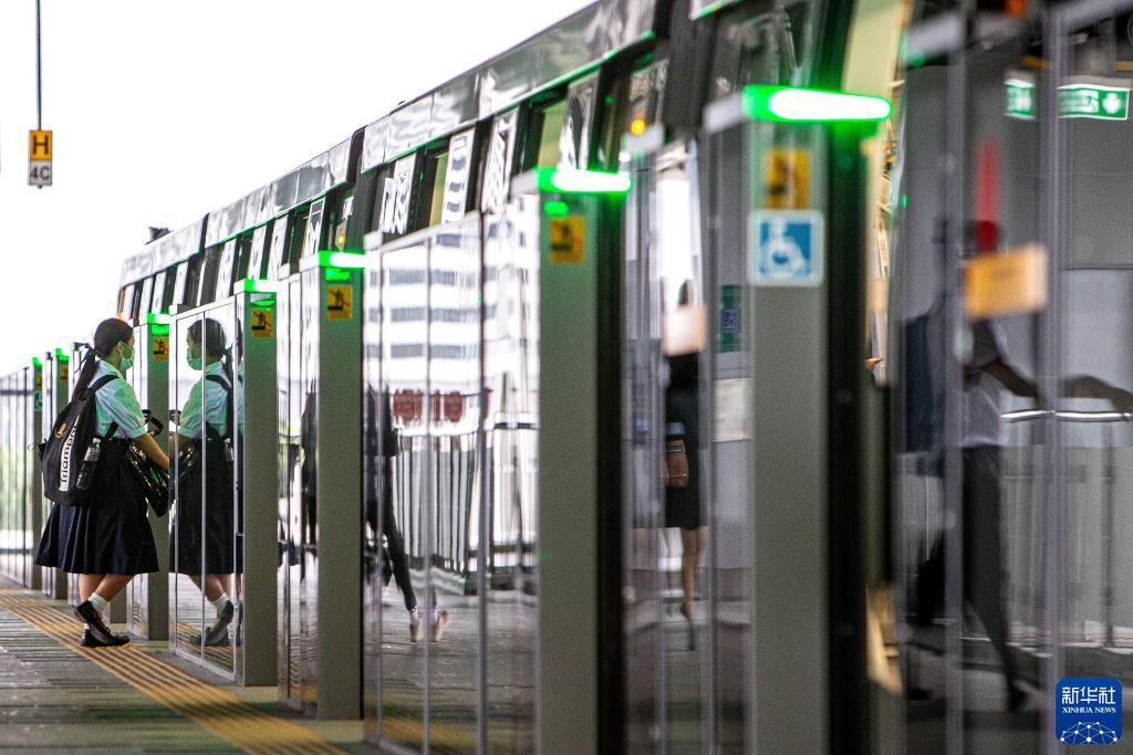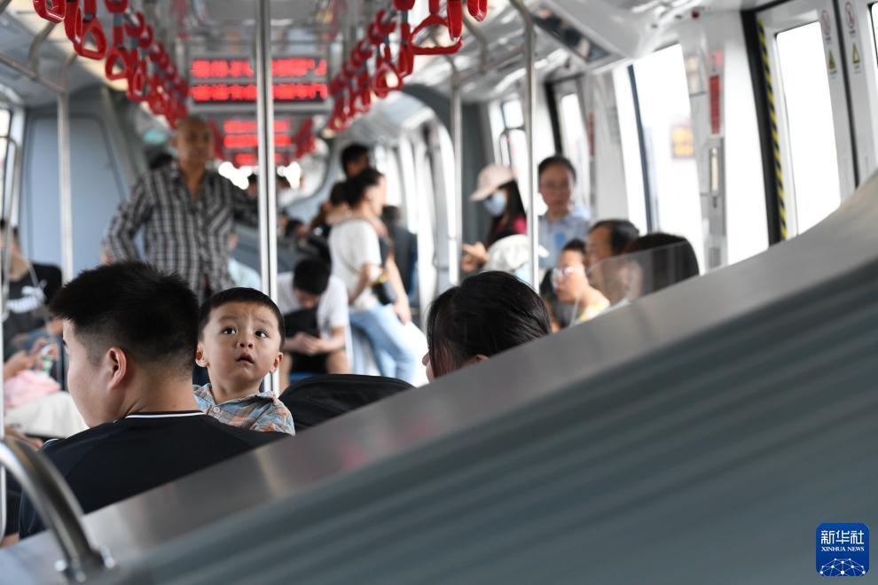 9月17日,家长和孩子在安徽芜湖市乘坐单轨列车。
