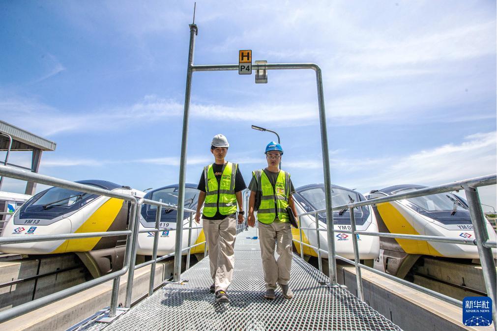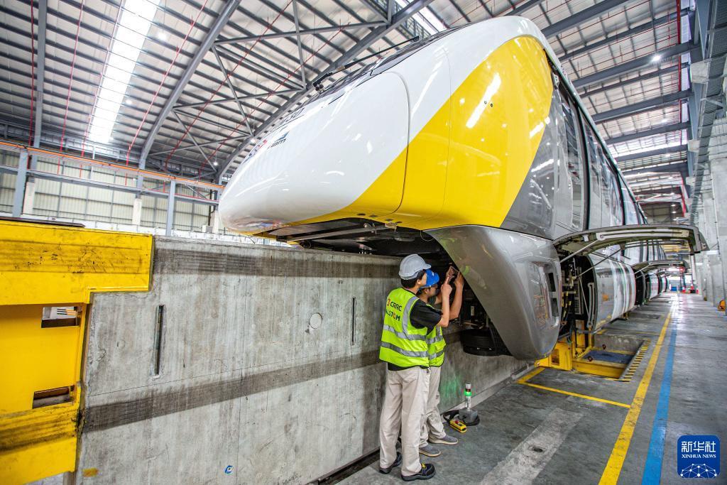 9月22日,在泰国曼谷“黄线”列车维护中心,中车浦镇阿尔斯通运输系统有限公司工作人员检修列车。