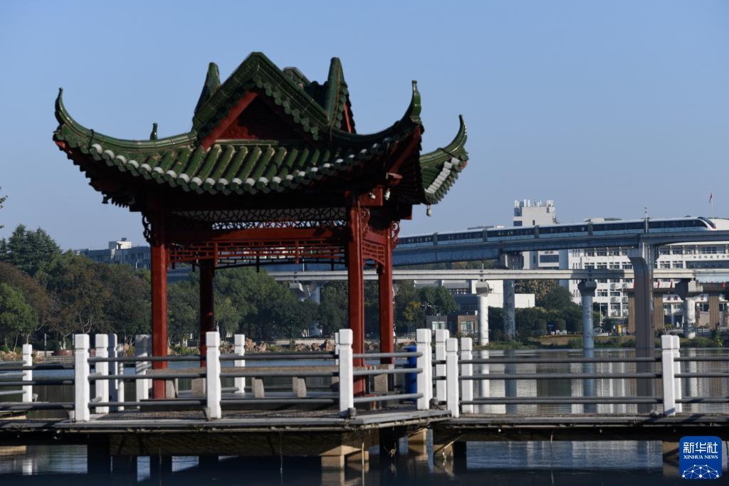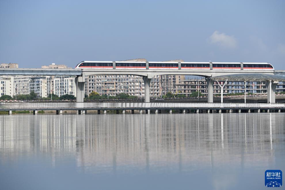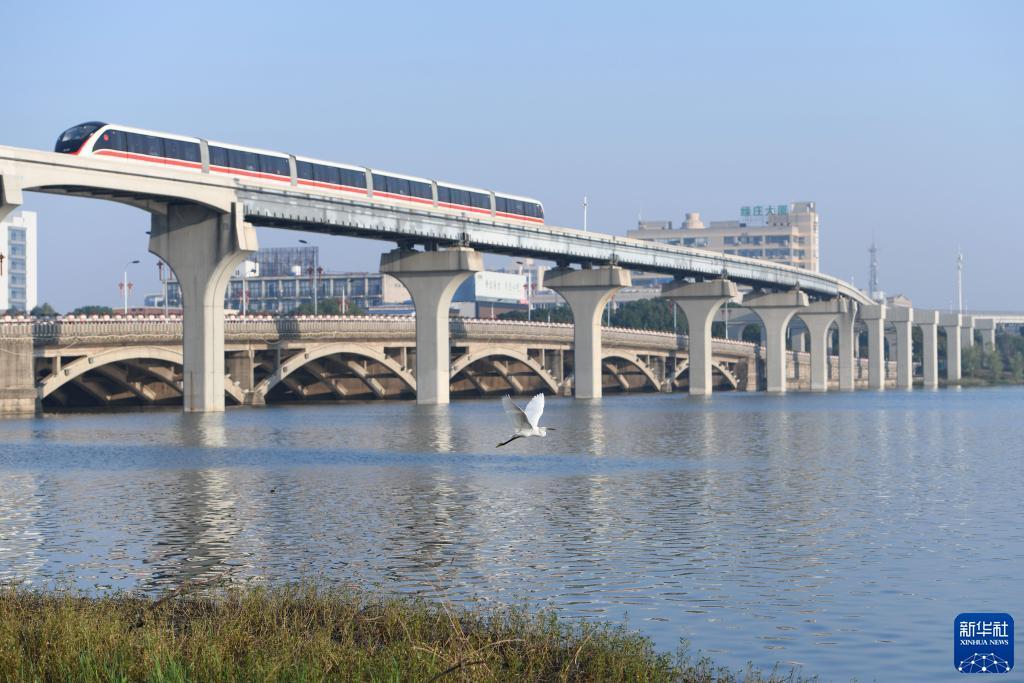 10月17日,一辆单轨列车行驶在安徽芜湖市镜湖上方。