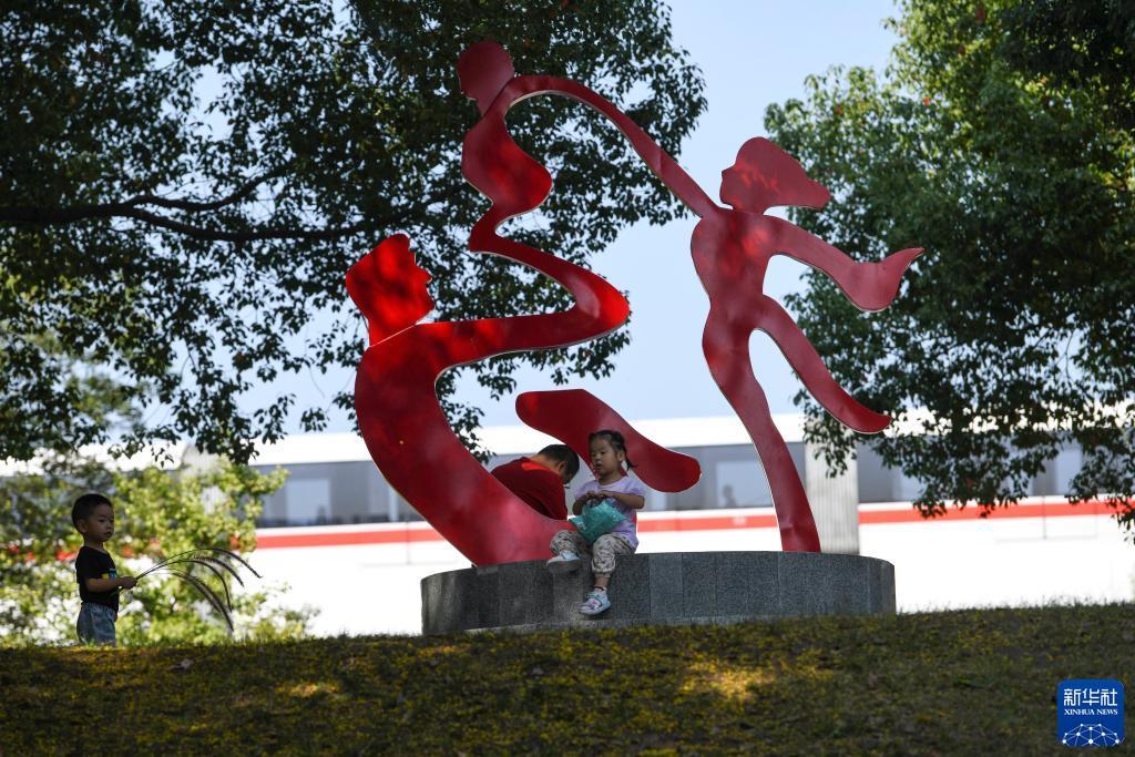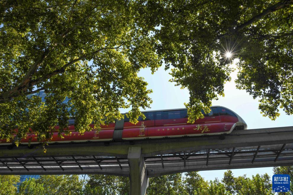 9月17日,单轨列车途经安徽芜湖市的一处街角公园。