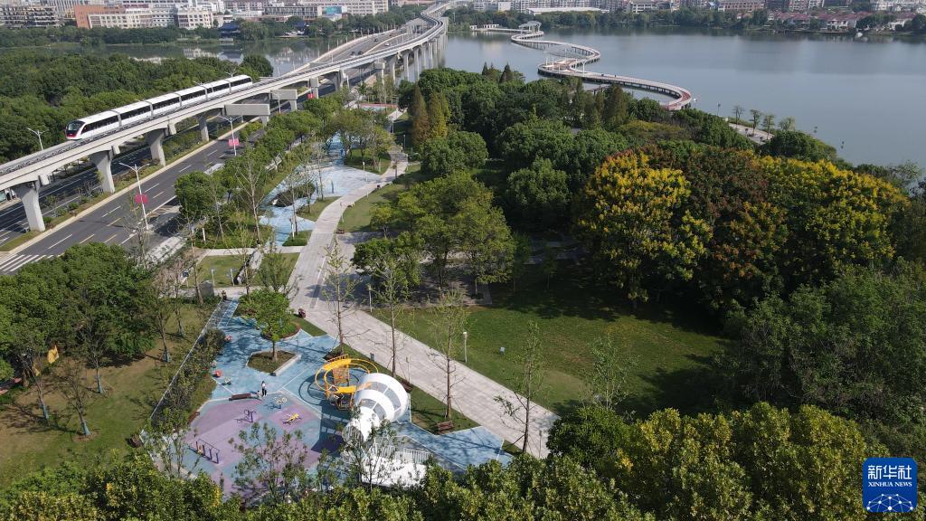 9月17日,一辆单轨列车在安徽芜湖市银湖公园附近行驶(无人机照片)。