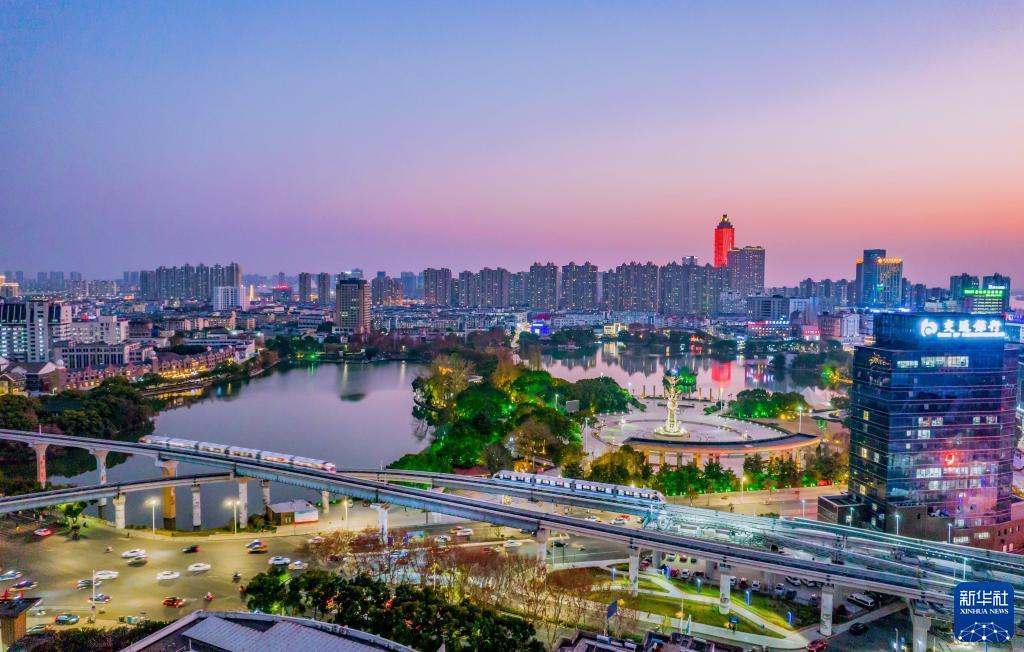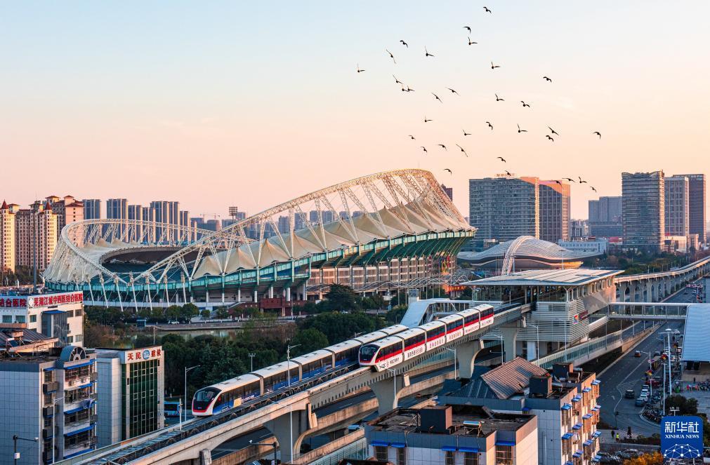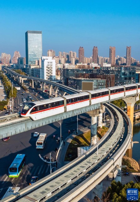 这是单轨列车行驶在安徽芜湖市区的景象(2023年1月10日摄)。