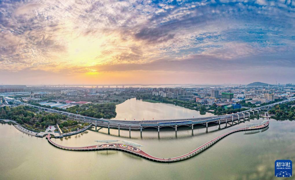 一辆单轨列车行驶在安徽芜湖市银湖上方(2022年10月30日摄,无人机照片)。
