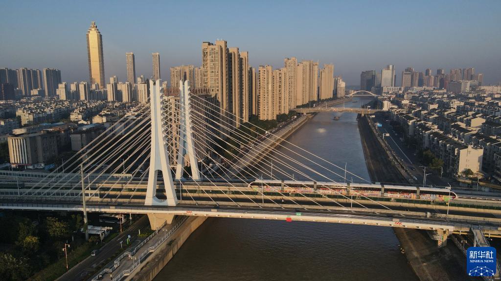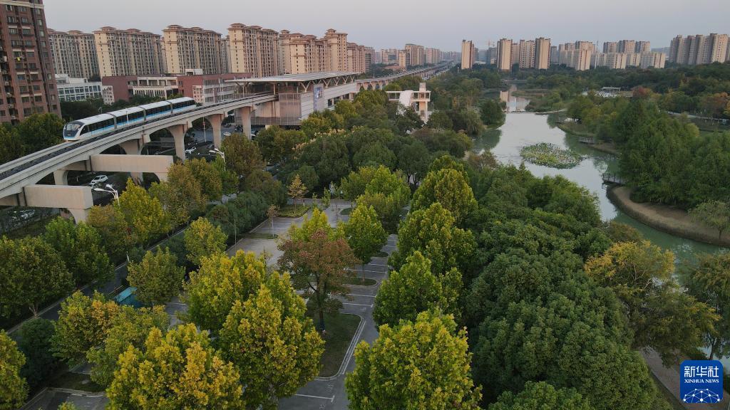 10月17日,一辆单轨列车行驶在安徽芜湖市区(无人机照片)。